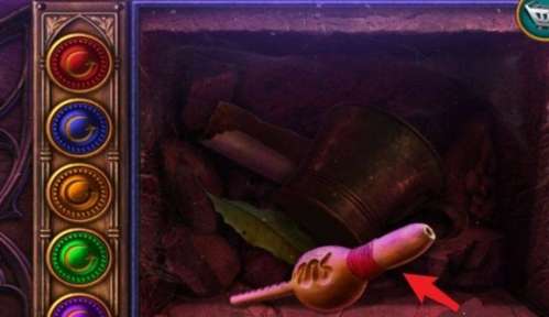 进入房子,右边壁炉捡起火的符号,用铲子铲灰,捡起框饰。左边地上,捡起火柴盒,小人。出门,在水车上用“火”打开柜子,得到