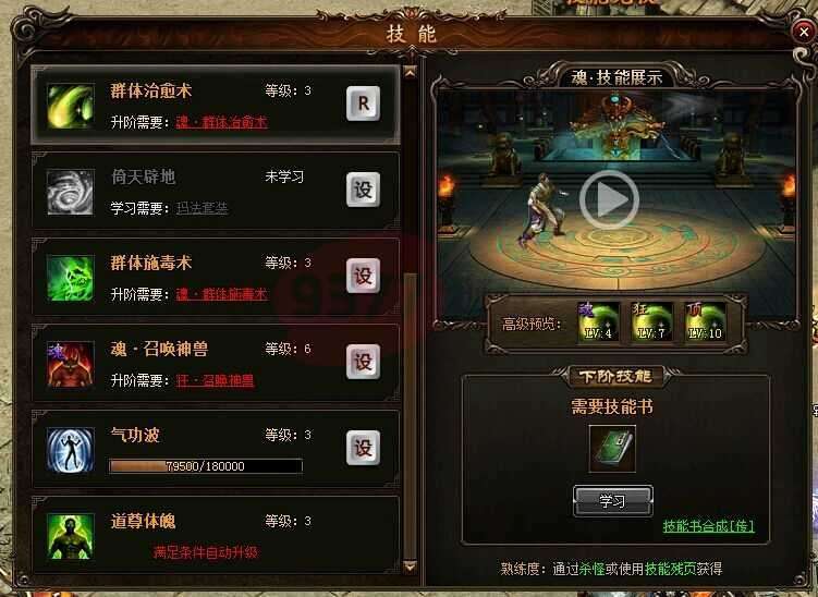 玩家要想提升技能等级的话,就要通过增加技能的熟练度值的方法,可帮助大家快速提升技能等级。当玩家的技能熟练度达到升级上限要求,技能等级自动提升。但是技能升级到3级、6级、9级后,继续升级4级、7级、10级的技能时,需要消耗对应的魂·技能书、狂·技能书、顶·技能书,才能继续提升技能等级的。