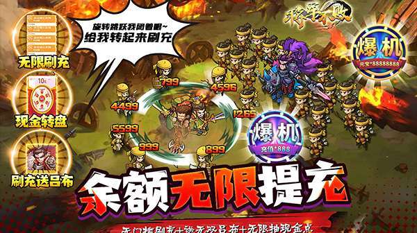 《将军不败(余额无限提充)》是一款三国放置Q版回合制手游。上线参与三英战吕布的割草小游戏,直接拿上千充值,能激活首充等各种累充活动~且每天有三次参与机会,一个靠割草游戏白嫖充值的玩法,规定时间内割草越多,获得的奖励越多,除了充值场还有元宝铜钱场,可以拿上亿元宝还有千万铜钱,直接爽到飞起,白嫖的充值获得还可以拿到神将吕布,闯关直接无压力。游戏通过培养武将实力,习得高级武将技能,游戏中不管你做什么都有道理,因为真正的热血的三国就是等你来成王!?
