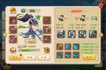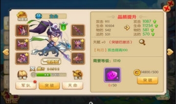 突破在武将培养中玩家前期主要追求目标,能够大幅度的提高武将属性,加快技能释放。武将的突破需要大量的突破石和武将碎片,突破石可以从突破石副本和祭祀获取。每位玩家每天有一定次数的打突破石副本和祭祀次数,获得突破石。武将碎片玩家则可以通关关卡切磋、神将商店、酒馆、获得。