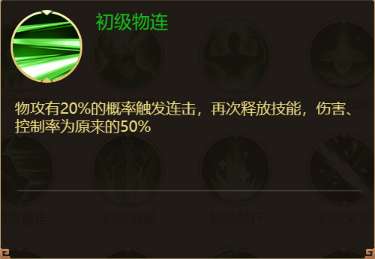 战法-物连(初/中/高/特级物连,物攻有20%/30%/40%/50%的概率触发连击,在此释放技能,伤害、控制率为原来的50%)