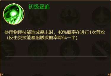 战法-暴追(初/中/高/特级暴追,使用物理技能造成暴击时,40%/60%/80%/90%概率进行1次普攻,反击类技能暴追触发概率降低一半)
