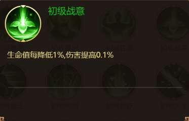 战法-战意(初/中/高/特级战意,生命值每降低1%,伤害提高0.1%/0.2%/0.3%/0.4%)