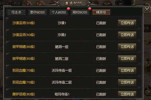 每5分钟刷新17个BOSS,击败BOSS可获得大量技能残卷和金币;