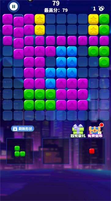 2、方块消除模式,类似俄罗斯方块,选择下方的方块放置到上方,当一整行被填满后即可消除。