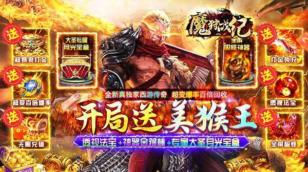 《魔狩战纪》真独家西游传奇,齐天大圣,大闹沙城,开局领美猴王,上线送透视法宝、如意金箍棒,再送全屏吸怪神技,全新优化所有boss爆率,小怪BOSS均掉落回收神器装备与终极时装,全面提升打金爽感,全新大圣专属系统三头六臂、七十二变,助力狂虐BOSS,猴王打BOSS,当然是一棒子一个,全程无付费卡点 ,所有地图爆大量充值,小怪掉充散人天堂,无限打金!全角色攻速大提升,开局开砍,暴爽打金!