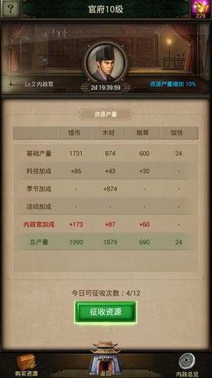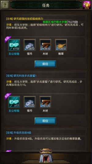 正所谓“官官相扣”,主公的等级跟内城官府挂钩,而太学院的等级也跟官府紧密相连。所以当官府提升等级时,必将影响其它建筑的提升建造。而建筑方面的升级,如果主公白天有时间挂机,也可以优先建造。因为所有建筑均为等级越高升级时长越多,所以没必要浪费白天做其它任务的时间来完成这个耗费时间的建筑升级。