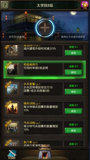 除此之外,你还有更重要的工作——太学院科技建造。太学院的建造建议主要以统帅力、点兵术、士兵宣誓为优先原则。因为不论是刷副本,还是打流寇,甚至报仇去抢敌人的资源,战力往往都是最重要的,而其它建筑的研究晚些时日也无大碍。