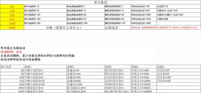 | 神卡选择包*2、元宝*10000、银币*10000000 极金装备任选*2、神级精炼石*5000、橙色宝物任选*2、宝物精炼石*3000 包子(中)*50、培养丹*200、转生丹*5000、宝物精华*20、魔化石*3000 | |||