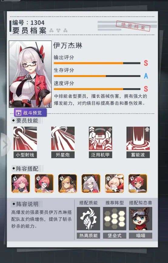 推荐理由:炽心阵容万金油输出。二技能歼星炮最高拥有超高的单体爆发伤害,而且对付低血线的敌人还有增伤效果,而且不依赖于敌人的状态环境,可谓是一个万金油输出。不过伊万杰琳每释放一次歼星炮,就会无法行动一回合,但未行动过的伊万杰琳,下回合将会对敌人造成更高的伤害!