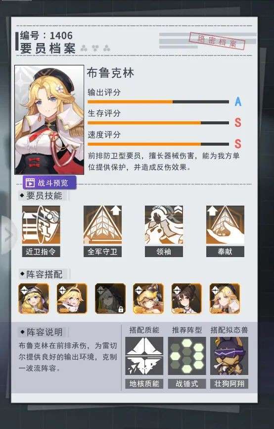 推荐理由:柯拉的上司,奈川的总指挥官,擅长根据战场情况调整部队的防御部署。布鲁克林的一技能可对生命占比最低的友方单位进行保护,分摊其受到的50%的伤害。布鲁克林的二技能可对前中排所有单位施加布鲁克林最大生命百分比的防护罩,提升前排的坦度。在布鲁克林退场的时候,还会给我方生命值最低的单位释放自身最大生命值的防护罩,纵使一人退场,奈川也永不倒下!