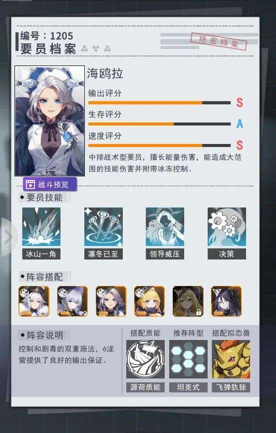 推荐理由:海鸥拉是海氏三姐妹中年纪最大的,同时也是海氏集团的大小姐。海鸥拉拥有极致的掌控冰雪的能力,能给敌人大范围地造成冰冻效果。海鸥拉的一技能可对敌方全体造成能量伤害,并有概率附加冰冻状态,而海鸥拉的二技能,将冰雪之力集中于一点,对敌方后排的一名敌人造成高额的能量伤害,同时对高血量敌人可进一步加深该伤害。海鸥拉做事果断,行事雷厉风行,对处于冰冻状态下的敌人,造成的伤害还会进一步提升。