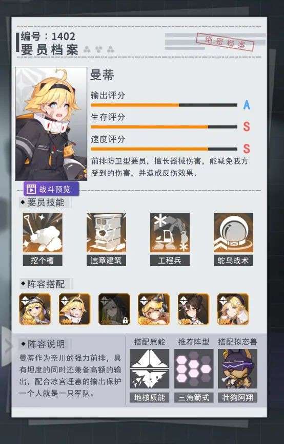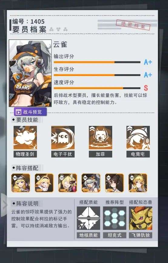 推荐理由:作为最重视防守的阵营,奈川不仅重视现实防御,在网络防御也从不含糊。而技术宅云雀,就是奈川网络防御的中坚力量。云雀的一技能,可对敌方速度最快的敌人造成能量伤害,并附加速度降低的效果。云雀的二技能,可随机对多名敌人造成能量伤害,并有概率进入癫痫状态——无法使用技能,且无差别攻击。而云雀的被动,可提升自己对异常状态敌人的命中率,进而瘫痪敌人设备,让敌人指挥部一团糟!