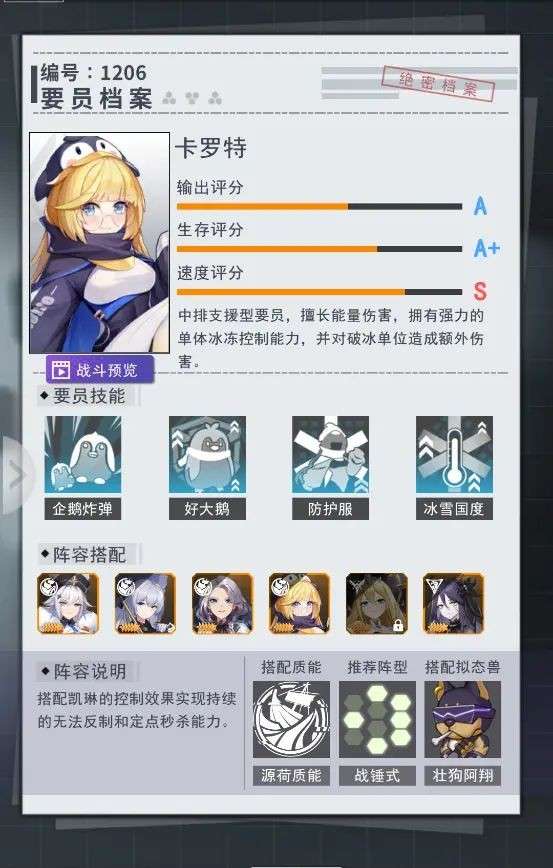 推荐理由:卡罗特是一位出生于艺术世家的怕热少女,平时在画画之余,喜欢吃雪糕和待在冰箱里,就想一只小企鹅一样。卡罗特的一技能可丢出一枚企鹅炸弹,对后排随机一名敌人造成造成能量伤害和大概率的冻结。卡罗特的二技能可给攻击力最高的友方释放“极地守护”效果,提升免伤效果和使目标友方造成的伤害有概率造成冻结效果。此外,回合结束的时候,卡罗特可对冻结的敌人造成其生命上限百分比的伤害,所以,卡罗特给的雪糕虽然好吃,但是可不要吃多哟~