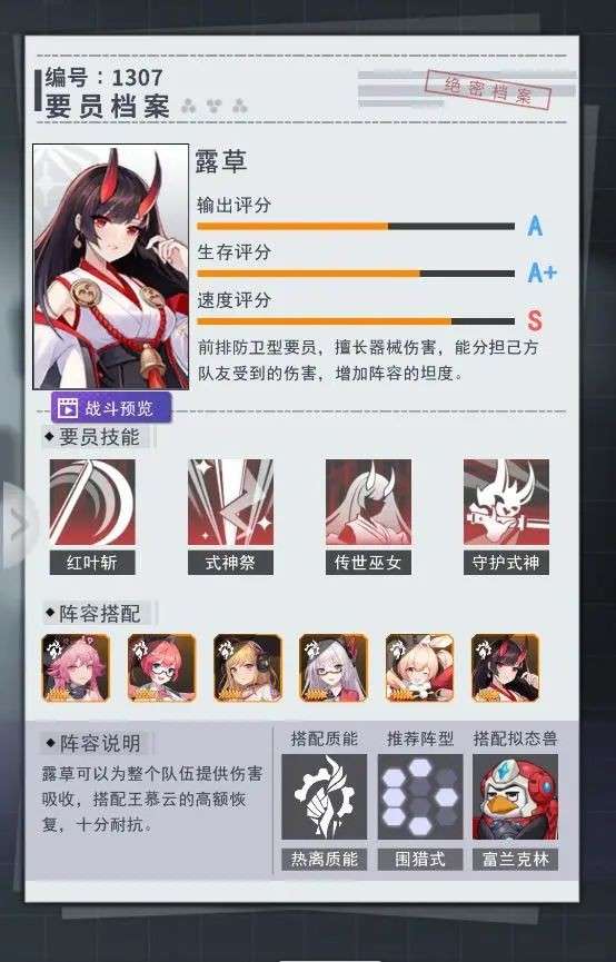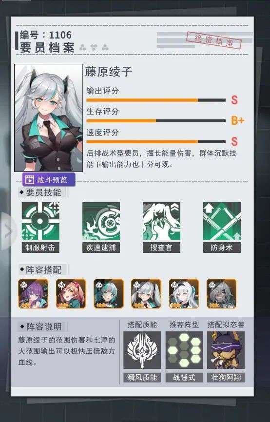 推荐理由:藤原绫子是联盟治安所的外勤搜查官,在富裕的家庭被抚养长大,因为家庭环境的原因形成了以个人为中心的性格。藤原绫子的一技能可对前中排三名敌人造成能量伤害,并有概率附带撕裂效果。藤原绫子的二技能可对全体敌人造成能量伤害,和有概率附带撕裂效果。倘若藤原绫子受到敌人的控制,则会触发自身本能的防卫,提升自身的免伤效果。