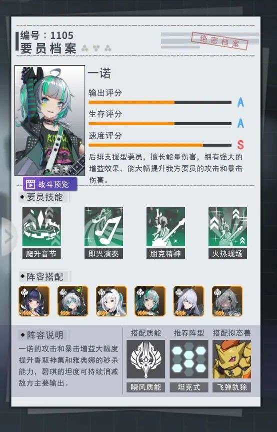 推荐理由:一诺,黑市人气最高的摇滚女乐手。摇滚乐的天才,狂热、振奋的演出风格就是她的代名词。一诺的一技能可让友方攻击力最高的3位队友提高攻击力,并附加持续恢复的效果。一诺的二技能可让速度最快的3位队友提高速度和能量免伤。据说,没有一个人在听了一诺的曲子之后,不感到精神激昂的!