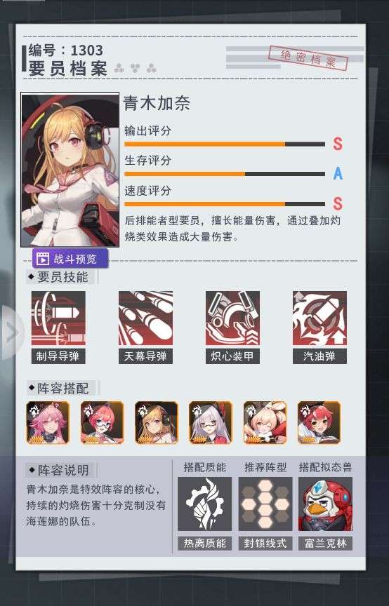 推荐理由:炽心阵容绝对输出核心。持续5个回合的无CD直线能量伤害,和对灼烧状态的敌人造成无视防御力的伤害是她的核心输出手法,主打一个高爆发。