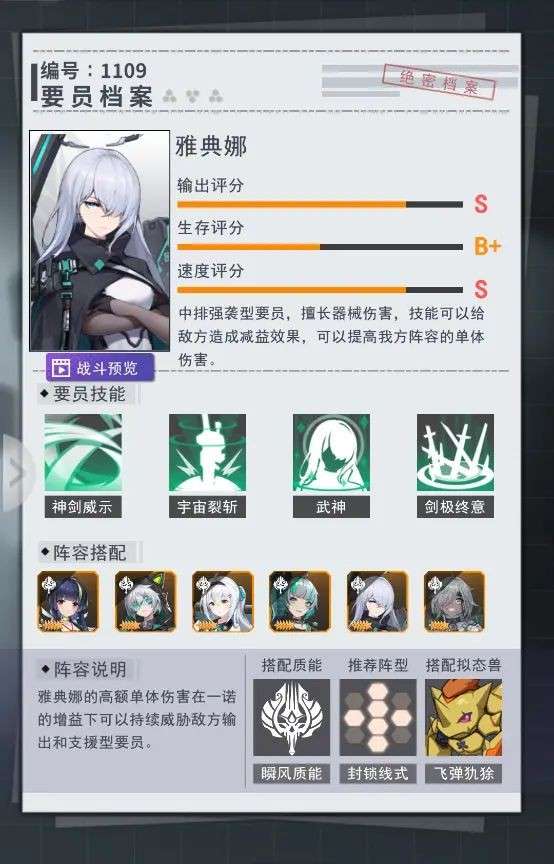推荐理由:雅典娜是被冠以“女武神”之名的存在,被认为是“假面舞会”的王女中个人战斗力最强的,且仍然没有达到顶端的人。雅典娜的一技能对全体敌人造成伤害并附加高额易伤状态,而二技能对站位相同的敌人造成大量伤害和有概率附加禁止暴击的状态!雅典娜在自身生命值越高时候,会对敌人造成更多无视防御力的伤害,在生命值越低的时候,会让自身获得更高的吸血效果!雅典娜在面对众多对手中,也就只有香取神集,能够被她记住。
