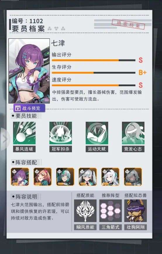 推荐理由:七津天生拥有超强的体魄,是个百年一遇的运动天才。七津一技能可打出三颗蕴含风能的扣杀球,对前排敌人造成附带生命值上限的伤害。而七津每次释放普通攻击和一技能,都有几率给自身添加“竞发心志”的状态,使得每释放一次二技能,消耗所有“竞发心志”状态,对随机2位敌人造成大量伤害!