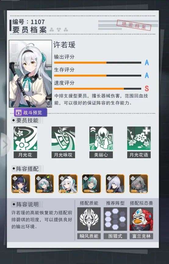 推荐理由:许若瑗因为受到了reaper病毒影响,从小就患有白化病,因此不得不长期坐在轮椅上。她擅长吹奏单簧管,借助音乐缓解自身的病痛——当然在战场上也可以对友方产生同等的效果。许若瑗的二技能,可以让队友立即回复生命值,并且提高暴击率。而许若瑗的被动,可让她离场的时候,立即让友方回复生命值。温柔而又坚强,这是大家对于许若瑗的评价。