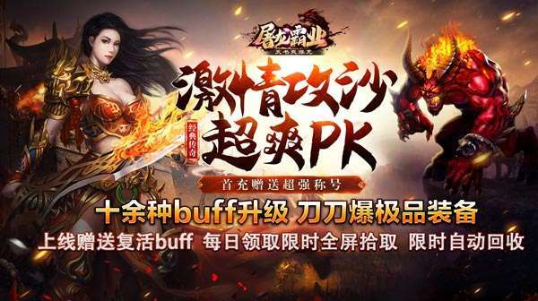 1、最强福利赠送!1阶甲套、复活buff、 新手隐身卷、仓库扩展卷 2、每天上线都能领取自动回收[限时]、全屏拾取[限时] 3、超多大陆,尽情挂机刷怪,杀怪换BOSS召唤卷轴,超高爆率超多装备等你来爆 4、十余种buff升级,刀刀爆极品装备 5、首充赠送超强称号,提升爆率发育快人一步