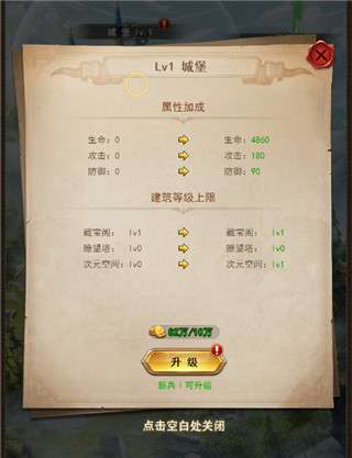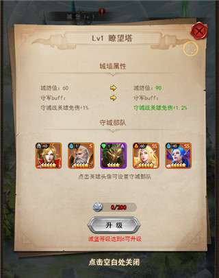 可消耗金币进行升级,升级城堡等级可以给所有英雄附加生命、攻击、防御属性值
