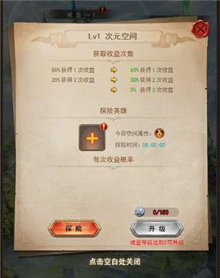 玩家可派遣英雄进入次元空间中探险,探险持续一段时间,英雄探险结束后可领取探险奖励,探险的英雄星级越高,次元空间等级越高获得的探险奖励越丰厚