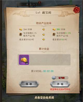 藏宝阁可消耗公会贡献进行升级,提升藏宝阁等级可以提升金币、攻城卡牌产出效率以及藏宝阁资源最大累计时间