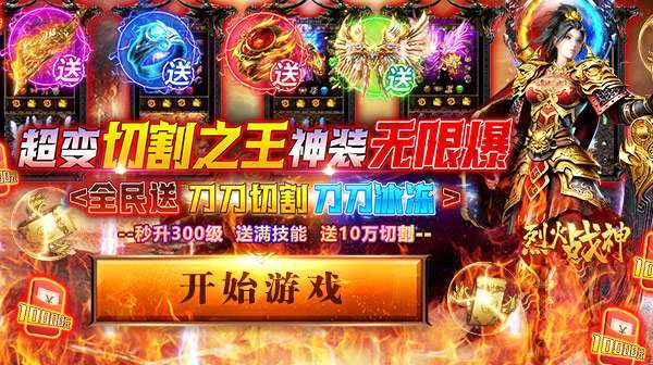 《烈火战神》(超变切割之王)携刀刀冰冻、刀刀999万切割超爽革新上线!开局送全套终极技能,全民免费送刀刀冰冻,再送刀刀10万切割,更有唯一切割装备刀刀切割+999万! 独家巨制,高清画质,超高爆率,上线秒升300级,散人真正零起步,满地装备刀刀爆! 装备全靠打,全自由交易,极限满攻速,超多独家神器,最爽传奇邀您零充体验!