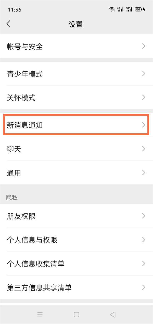 2、然后点击新消息通知。