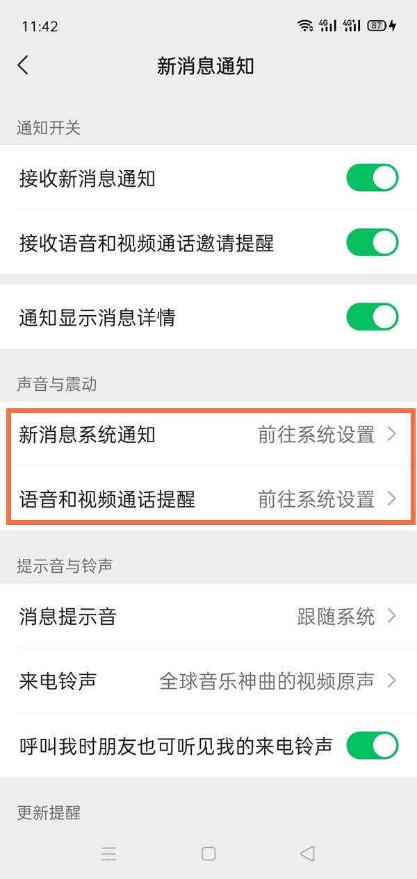 3、接着在声音与震动选项下,分别点击新消息系统通知以及语音和视频通话提醒。