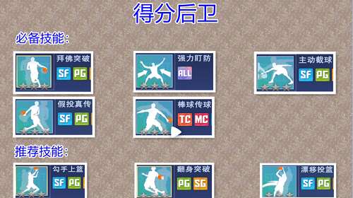 2、普通技能升级顺序:强力盯防>主动截球>漂移投篮>假投真传。
