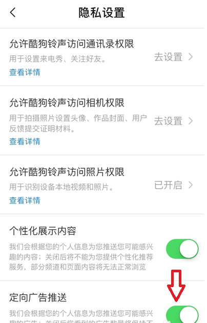 6、这下,我们就将酷狗铃声定向广告推送关闭啦!
