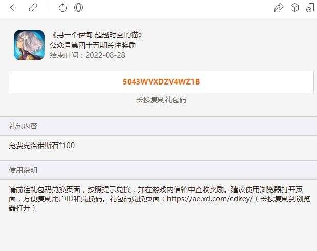 礼包码兑换页面:https://ae.xd.com/cdkey/(长按复制到浏览器打开)