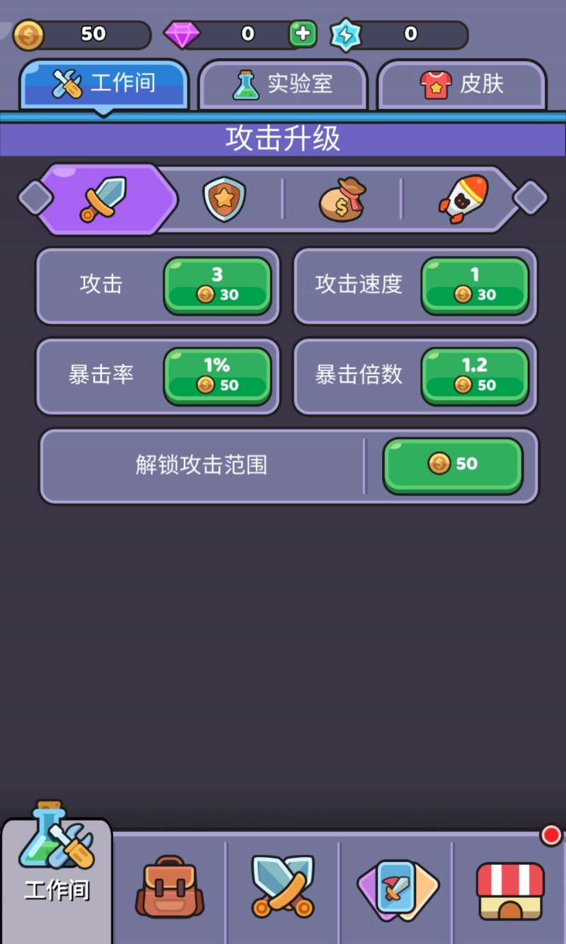 打几局之后你会看到实验室,实验室前期点死游戏速度!!!剩下的不用管,总之难度一你就把攻击,攻速,伤害加成点死就行,对了肉食奖励和金币奖励记得也解锁还有物理防御也解锁,卡片选攻击,天神庇佑,生命值/肉食/敌我平衡/范围