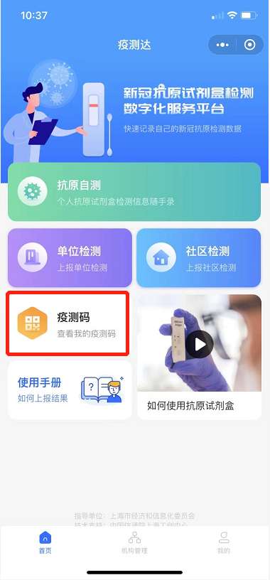 1、开启微信app,找到疫测达小程序,点击首页中的疫测码功能。