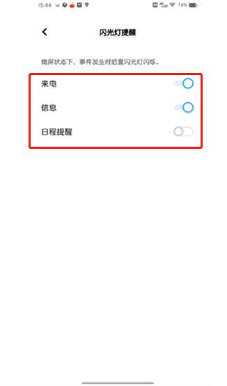2、在这里可以将来电、信息、日程提醒右侧的按钮开启即可。