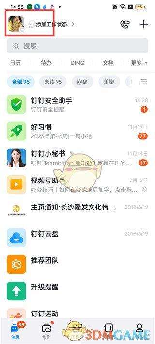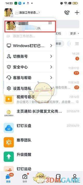 1、首先打开钉钉软件,进入到钉钉首页中我们可以在消息的页面中切换到协作、工作台、通讯录和我的页面中,在这里我们需要点击左上角的【头像】;