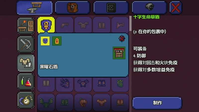 十字盾的合成树也就决定了它的功能,继承了黑曜石盾的免疫击退和火块,也继承了所有免疫debuff饰品的能力。在游戏内的描述里,它可以免疫大部分减益,因此十字章护盾是一个强力饰品。