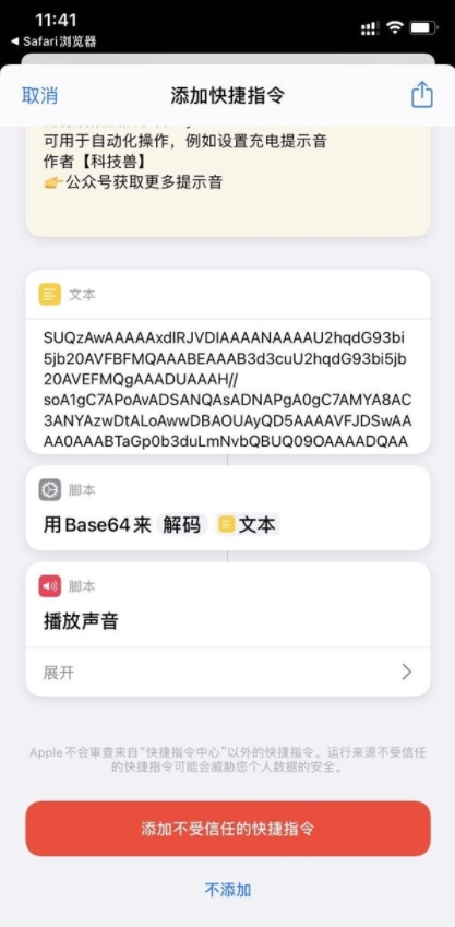 2、打开icloud中的yoho提示音,并点击获取捷径,点击添加不受信任的快捷指令。