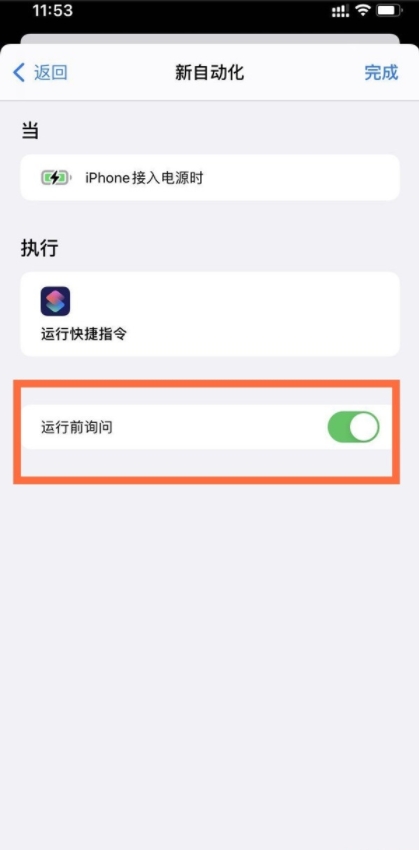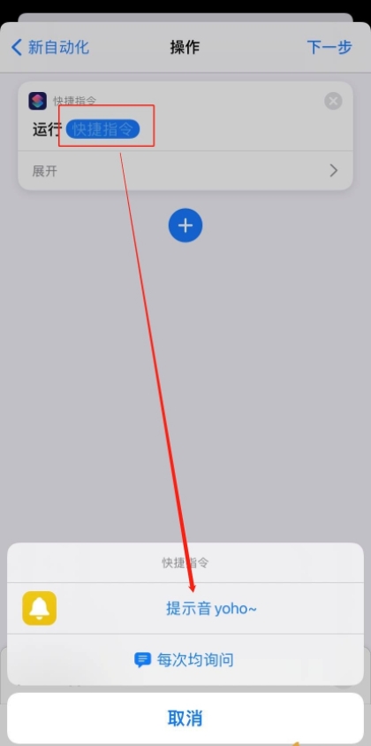 5、再次点击快捷指令,选择提示音yoho,点击下一步,将运行前询问的开关关闭,然后使用充电器给iPhone手机充电就会有提示音出现。