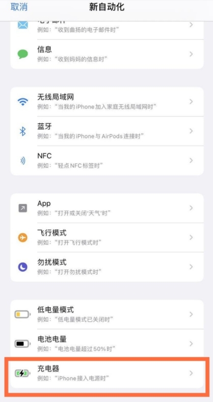3、打开快捷指令,点击自动化>创建个人自动化>充电器。