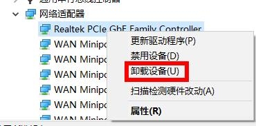 3、在设备管理器中找到“网络适配器”右击驱动点击“卸载设备”。