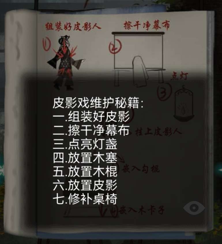 7.右转,根据3发现的皮影人维护秘籍,把凳子腿装在坏凳子上,用锤子固定,凳子修好了。点幕布,在桌子上装上5块皮影碎片,得【皮影人】。用湿毛巾擦干净幕布,用火柴点亮油灯,把木块装在桌子凹槽处,插上勾棍,挂上皮影人。