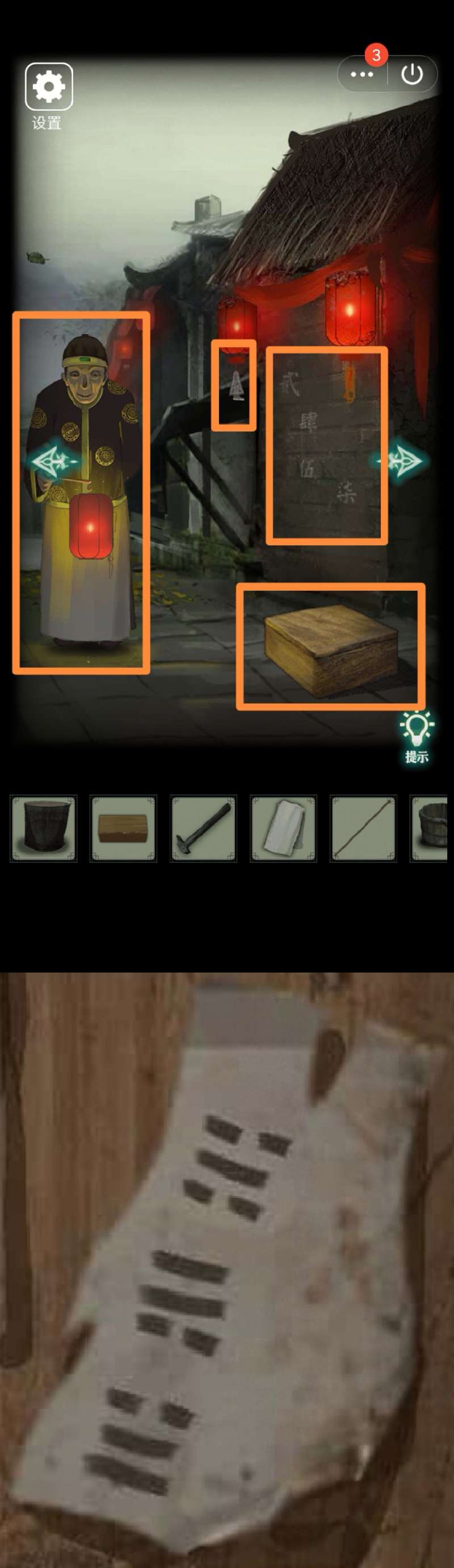 5.右转,从上到下观察墙壁4个大写数字(贰肆伍柒)。发现村长赶我走(这个形象真阴森)戏台坏了需要修、地上盒子3位八卦符号锁、左边灯笼挂着的碎片够不着需要找东西垫脚。根据2发现的八卦符号开盒子,得【凳子腿】。用木桩垫在灯笼下,得【皮影碎片(四)】。