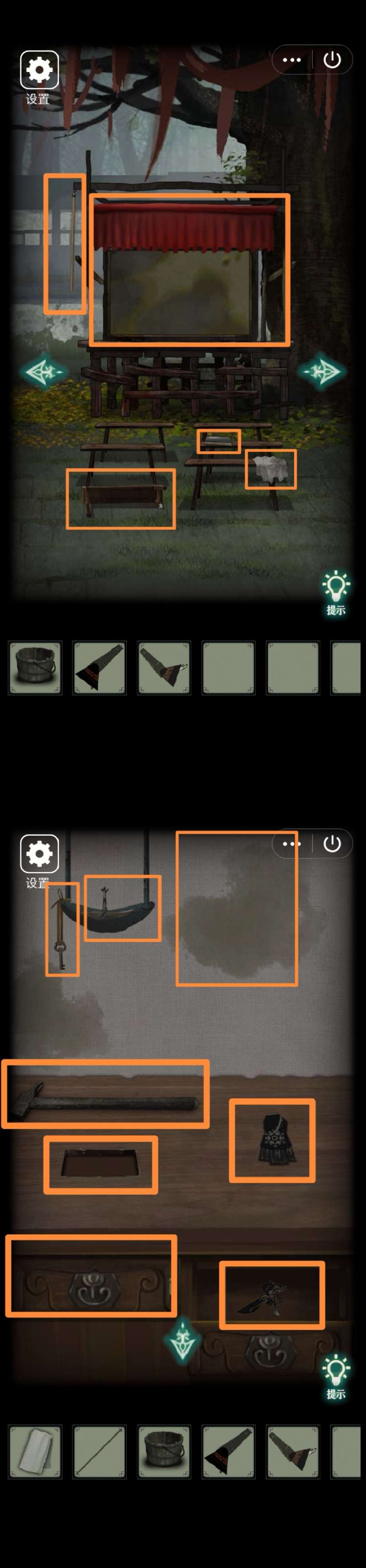 3.右转,地上右边凳子上拾取【干毛巾】、架子上拾取【勾棍】,发现地上左边凳子腿断了需要修补好、右边凳子上皮影戏维护秘籍。点幕布,油灯边拾取【钥匙】、桌上拾取【锤子】。发现左边抽屉需要钥匙开锁、桌上一个凹槽、右边皮影碎片皮影人由头部四肢躯干五块组成(可以把已经收集到的3块皮影碎片先放上去,也可以等全收集齐了再一起放)、吊着的油灯、背后的幕布很脏需要擦干净。打开桌子右边抽屉,得【皮影碎片(三)】。用钥匙开桌子左边抽屉,得【木块】