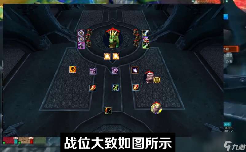 开打之前,大致分一下近战打镇压者的方向,两边各分一半就可以了。战位大致如图所示,安排风中瘸子的猎人、安排进门的治疗,同时呢给带位置的治疗一个标记、安排法师给绿龙保持魔法增效的buff。一行大团,DPS的优先级开打之后团长只需要报场外刷新的怪的位置方向就可以了,剩下的交给他们自己发挥。嗜血根据情况开,观察boss的血量80%以上,或者进门的治疗组有两到三个叠到了30加以上的层数就可以开了。