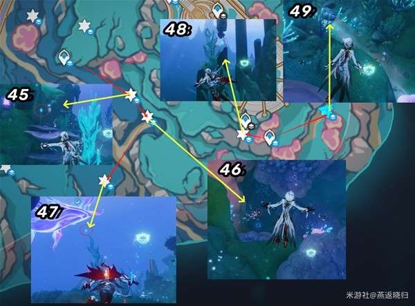 47:从46的位置往西南方向的上方,一直游,在大水草的上面;
