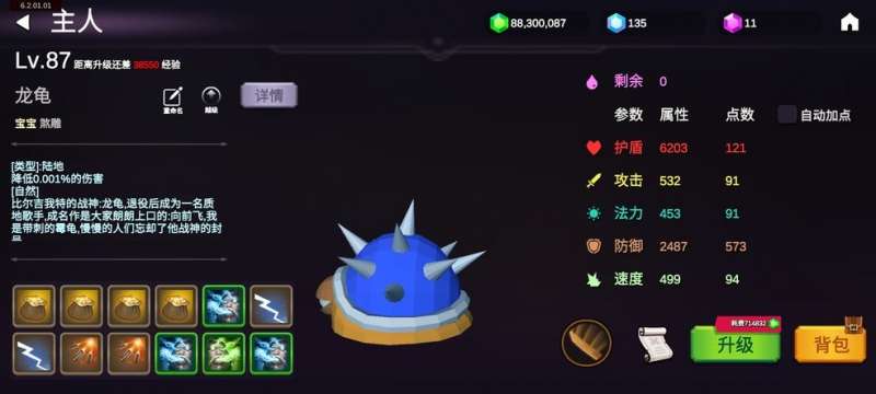 前期先随便过图,然后10层抓一只普通10资质的龟,普通就行,升级快,主要防御资质够高就行。然后龟去肉鸽,死后提升页面点击左上广告,选格子,开出12格。之后继续过图,宝宝全点耐力,前期随便带点技能,抽到技能再换(可以覆盖已学技能),推荐4核武,1吸血,2吸蓝,其他格子随意,剩下的我全带的偷钱,然后就一边过图一边刷钱,自动挂机,无压力。中期可以核武换天劫。
