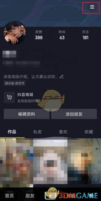 1、进去抖音个人主页之后,然后点击右上方菜单